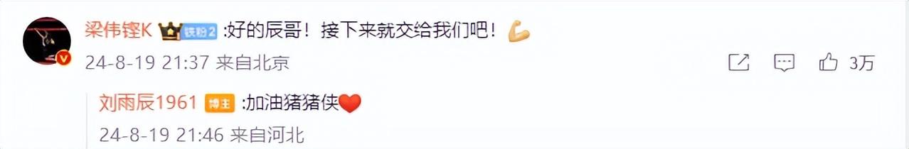19日晚间,梁伟铿回复刘雨辰称:“好的辰哥!接下来就交给我们吧!”刘雨辰则表示:“加油猪猪侠。”
