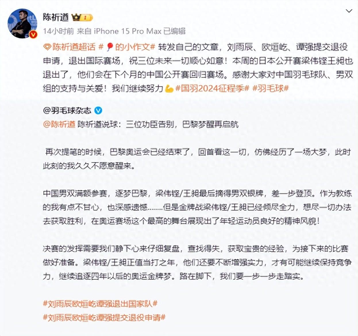 8月19日下午,中国羽毛球队教练员陈祈遒发文称刘雨辰、欧烜屹、谭强提交退役申请,退出国际赛场。