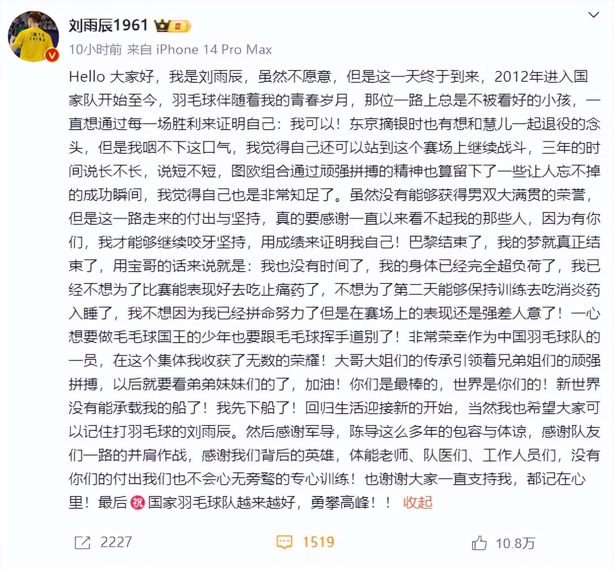 随后,刘雨辰发文回应退役:虽然不愿意,但是这一天终于到来,2012年进入国家队开始至今,羽毛球伴随着我的青春岁月。……东京摘银时也有想和慧儿一起退役的念头,但是我咽不下这口气,我觉得自己还可以站到赛场上继续战斗,三年的时间说长不长,说短不短,图欧组合通过顽强拼搏的精神也算留下了一些让人忘不掉的成功瞬间,我觉得自己也是非常知足了。
