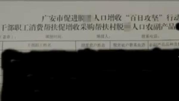 8月20日,一份四川广安市干部职工消费帮扶促增收、采购农副产品的表格在网上引发关注。表格分成几列,分为干部职工姓名、农户姓名、农户联系电话、农副产品品种及数量,购买金额。表格内容被涂上黑色马赛克。表格下方备注内容为:县处级干部每人每月300元,正科级干部及相当职级、事业干部管理7级(专技7级)及以上每人每月230元,其他干部每人每月170元。