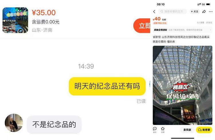 记者在某二手交易平台搜索“山东省科技馆”,界面显示“没有找到你想要的宝贝”,但仔细观察之下却发现了猫腻。相关链接中出现了很多售卖“山东省科技馆周边文创”的信息,价格30元-50元不等,且在介绍里标注了“就是你要的”“懂得来”等暗示。不少买家在下方询问“周六的票有吗”“周天可以吗”等问题,卖家通常回复“私聊”。记者尝试与其中一位卖家私聊,询问还有没有纪念品,卖家直言“不是卖纪念品的”;同时,预设的智能回复显示“24-25这两天有,周末有,其它日期没有。”