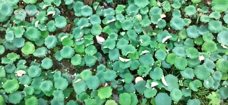 放眼望去,荷塘里满目荷花依然亭亭玉立;临近处暑,当地的莲子采收也进入高峰期;从空中俯瞰,穿着水裤的莲农三五成群穿梭在茂密的荷花丛中。