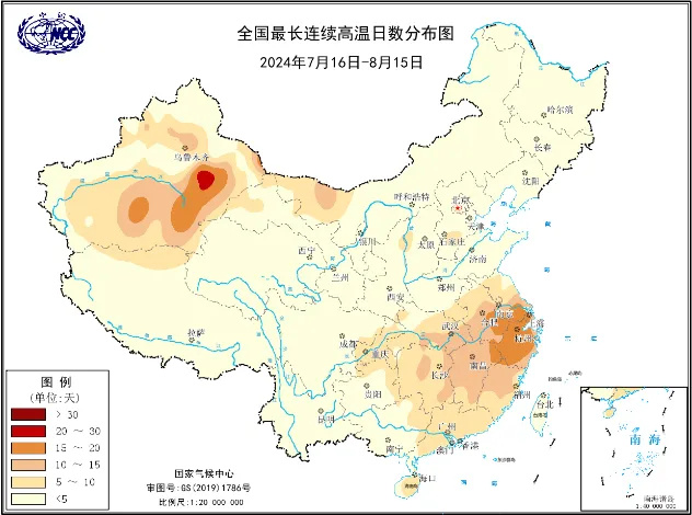 2024年7月16日至8月15日全国最长连续高温日数分布图