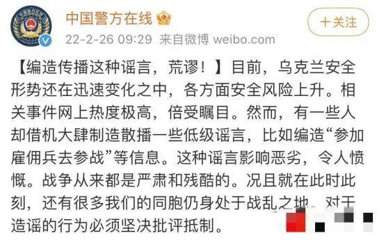 针对此类谣言,@中国警方在线曾经表示,这种谣言影响恶劣,令人愤慨。战争从来都是严肃和残酷的,况且就在此时此刻,还有很多我们的同胞仍身处于战乱之地。对于造谣的行为必须坚决批评抵制。