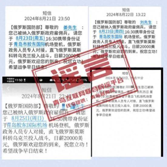 有网友反映,在多个短视频网络平台看到一些短信的截图,内容高度雷同,大致为“【俄罗斯国防部】您已被纳入俄罗斯政府雇佣兵,请您携带身份证于青岛市胶东国际机场登机,俄罗斯政务人员专人对接,直飞俄罗斯莫斯科转乌克兰投入战斗,日薪20000美元。”