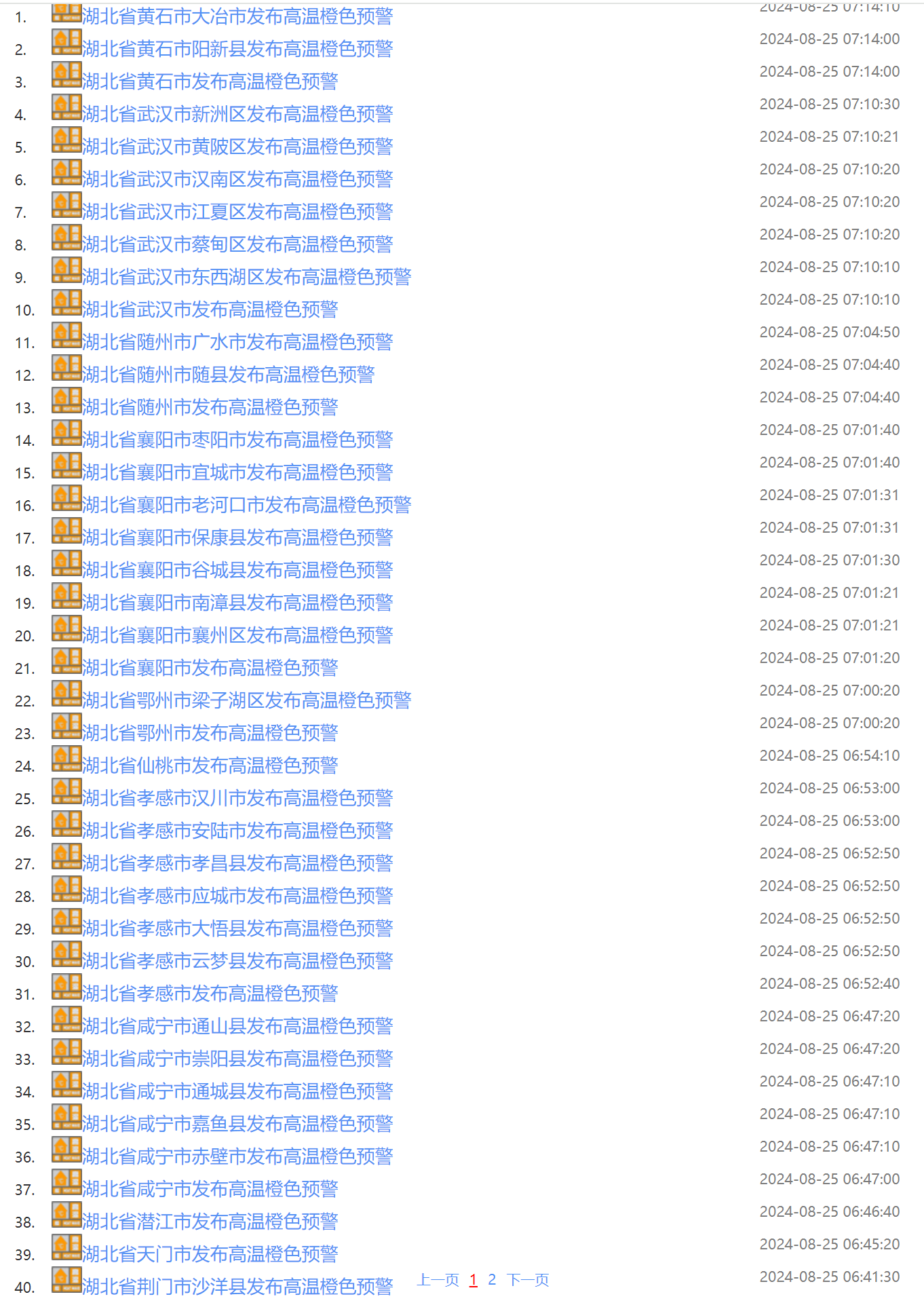 武汉市气象台2024年08月25日07时10分发布高温橙色预警信号:预计今天白天,武汉大部街道(乡镇)最高气温将升至37℃以上,局地可达40℃以上,请加强防范。