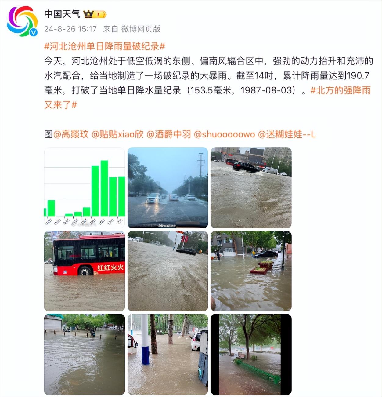 8月26日,据中国天气消息,河北沧州处于低空低涡的东侧、偏南风辐合区中,强劲的动力抬升和充沛的水汽配合,给当地制造了一场破纪录的大暴雨。