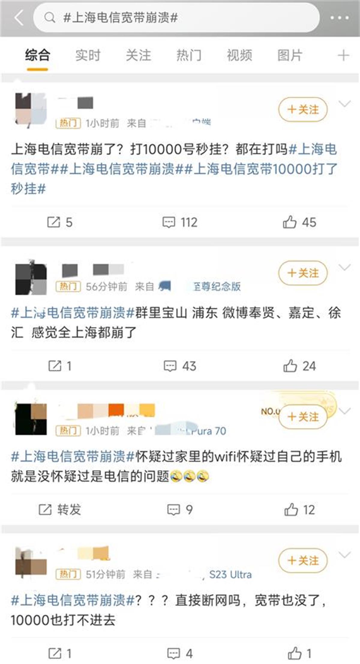 网友反映上海电信网络故障(社交平台截图)