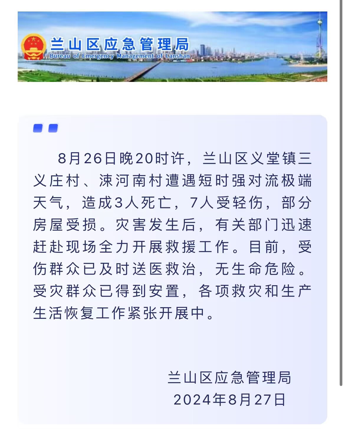 南村遭遇短时强对流极端天气,造成3人死亡,7人受轻伤,部分房屋受损。灾害发生后,有关部门迅速赶赴现场全力开展救援工作。目前,受伤群众已及时送医救治,无生命危险。受灾群众已得到安置,各项救灾和生产生活恢复工作紧张开展中。