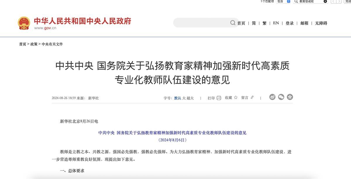 8月26日,中共中央、国务院发布关于弘扬教育家精神加强新时代高素质专业化教师队伍建设的意见(下称《意见》),提出要维护教师合法权益,维护教师教育惩戒权。