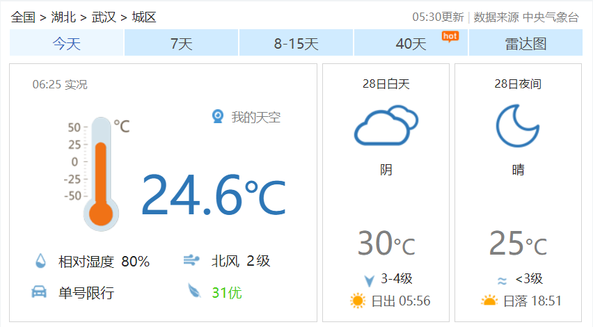 预计今明两天,武汉市阵雨模式持续,北风较强,高温有所缓和,今天(28日)最高气温将降至29℃,最低气温仅25℃。不过反转要来了!30日后,省内高温将再度发展,最高气温可达35~40℃。