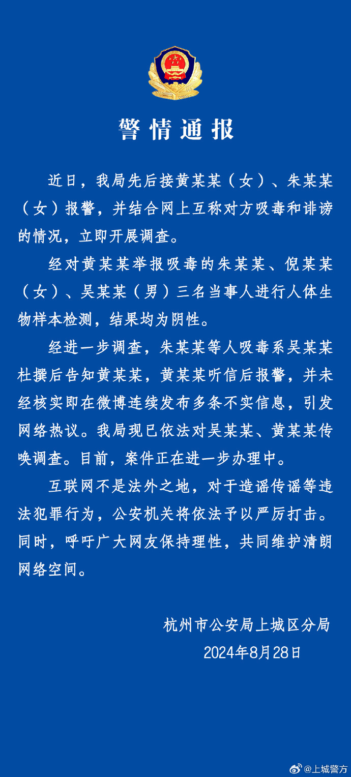 近日,我局先后接黄某某(女)、朱某某(女)报警,并结合网上互称对方吸毒和诽谤的情况,立即开展调查。 经对黄某某举报吸毒的朱某某、倪某某(女)、吴某某(男)三名当事人进行人体生物样本检测,结果均为阴性。 经进一步调查,朱某某等人吸毒系吴某某杜撰后告知黄某某,黄某某听信后报警,并未经核实即在微博连续发布多条不实信息,引发网络热议。我局现已依法对吴某某、黄某某传唤调查。目前,案件正在进一步办理中。 互联网不是法外之地,对于造谣传谣等违法犯罪行为,公安机关将依法予以严厉打击。同时,呼吁广大网友保持理性,共同维护清朗网络空间。