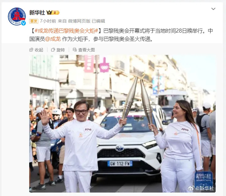 另据@新华社,巴黎残奥会开幕式于当地时间8月28日晚举行。中国演员成龙作为火炬手,参与巴黎残奥会圣火传递。