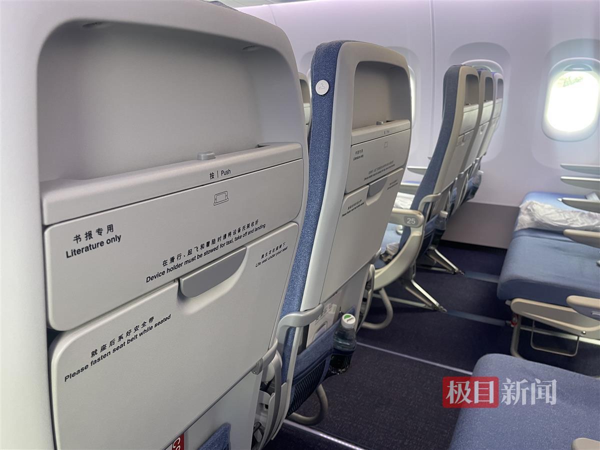身高1.73米的汤女士坐在经济舱座位上,膝盖距离前面座位大约一拳半。她说,以前乘坐飞机时,有时候膝盖会顶到前排座椅,舒适度欠佳,国航C919的布局对个子高的旅客比较友好。