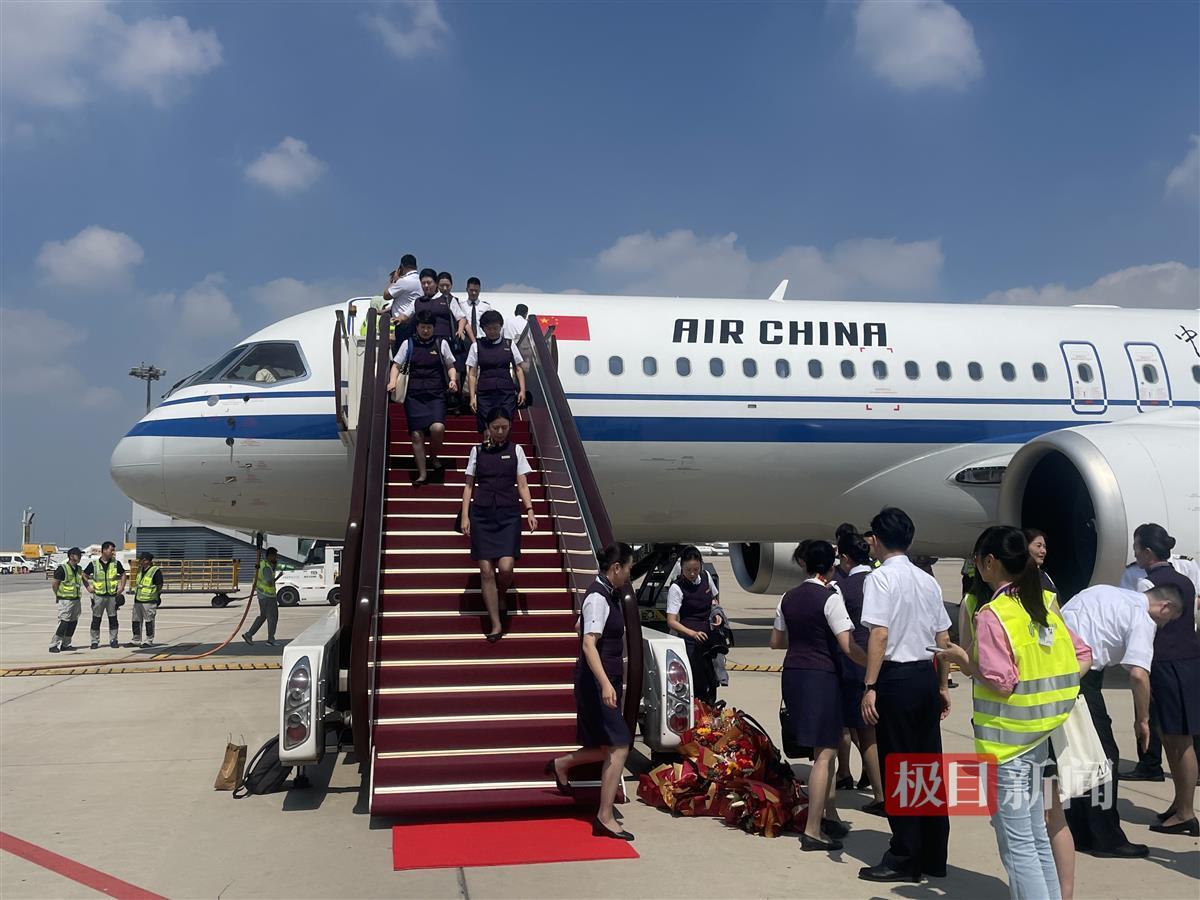 国航C919落地北京,人员有序下机