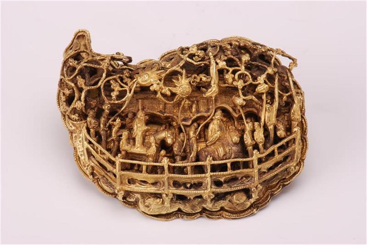 在明朝,发髻上插戴的各式簪钗被称为头面,明代土司女眷一般也拥有数副头面,此次展出的展品中,就有多件精美的金银发饰。如明代镂空人物楼阁金发簪以镂空工艺在发簪顶部雕刻出一座精美的楼阁,楼阁中点缀着栩栩如生的人物形象,楼阁之上则是繁复精致的累丝花叶。整个发簪设计巧妙,层次分明,楼阁的细节雕刻尤其引人注目,侧面展现了明代贵族的奢华生活以及明代工匠的高超技艺。