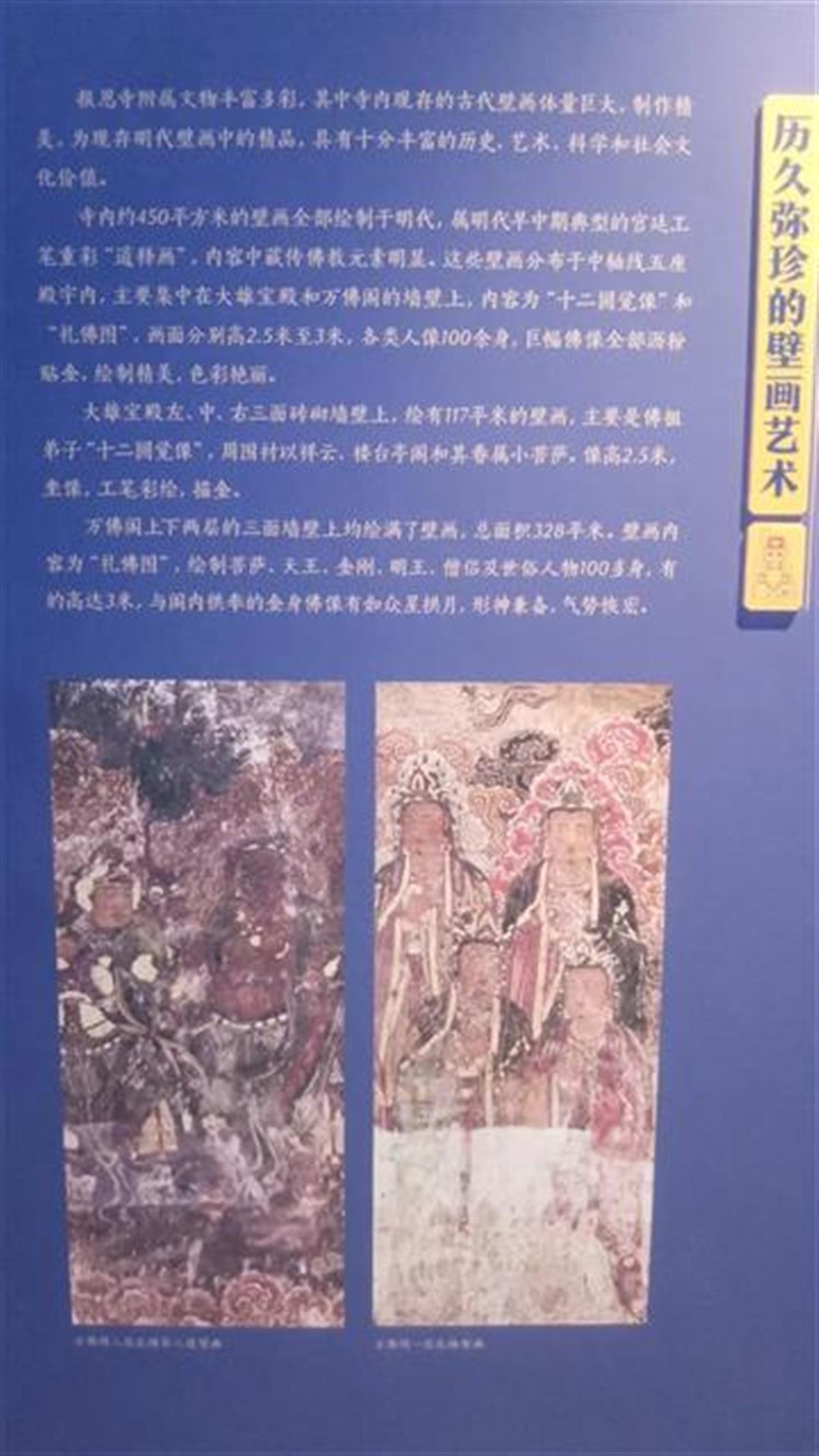 走入展厅中庭,几幅华美辉煌的壁画映入记者眼帘,这正是平武报恩寺寺内壁画复原图。报恩寺由平武土司王玺父子主持修建,绵阳市博物馆展览和保管部副研究馆员李生向记者介绍,报恩寺是我国现存最完整的明代古建筑群之一,寺内建筑、壁画与石刻做工精美、全寺建筑由当地出产的珍贵楠木所建,金碧辉煌。