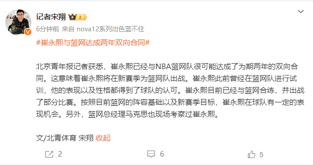 北京青年报记者宋翔称,崔永熙已经与NBA篮网队很可能达成了为期两年的双向合同。这意味着崔永熙将在新赛季为篮网队出战。崔永熙此前曾经在篮网队进行试训,他的表现以及性格都得到了球队的认可。崔永熙目前已经与篮网合练,并出战了部分比赛。按照目前篮网的阵容基础以及新赛季目标,崔永熙在球队有一定的表现机会。