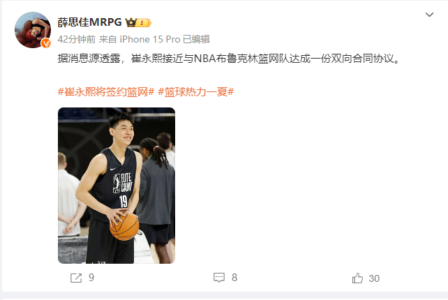 北京时间8月29日,多位篮球媒体人透露,中国篮球运动员崔永熙接近与布鲁克林篮网队达成一份双向合同协议。