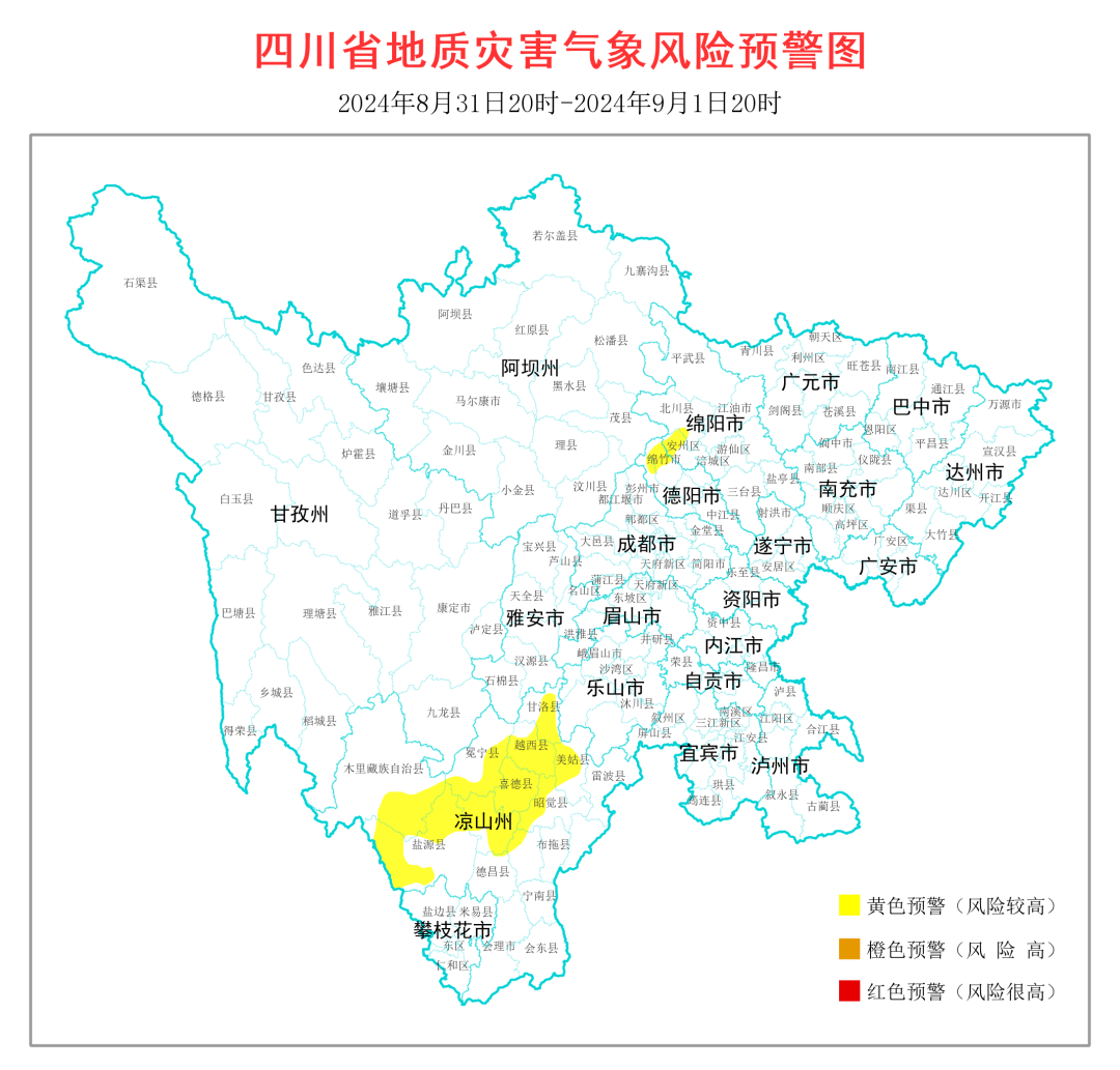 四川省地质灾害防治指挥部办公室发布8月31日20时至9月1日20时全省地质灾害气象风险预警信息显示,凉山州西昌市、木里县、盐源县、德昌县、普格县、昭觉县、喜德县、冕宁县、越西县、甘洛县、美姑县发生地质灾害的风险较高(黄色预警)。