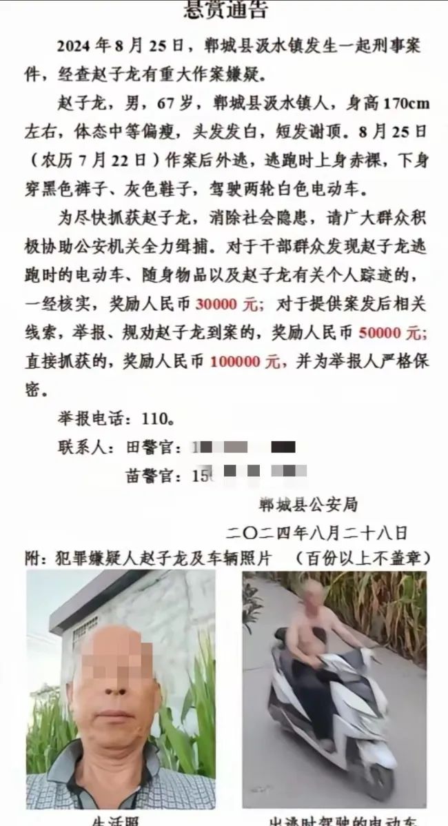警方此前发布的悬赏通告显示,赵子龙,男,67岁,郸城县汲水镇人,身高170cm左右,体态中等偏瘦,头发发白,短发谢顶。8月25日(农历7月22日)作案后外逃,逃跑时上身赤裸,下身穿黑色裤子、灰色鞋子,驾驶两轮白色电动车。