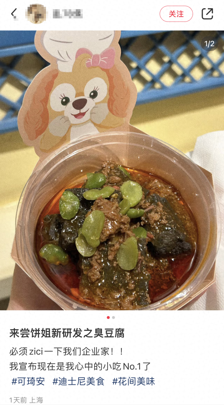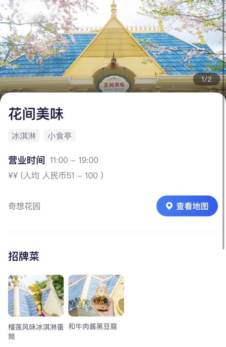 橙柿记者迪士尼乐园APP上发现,乐园内“花间美味”小食店上架了两款新产品,分别是牛肉酱黑豆腐和榴莲冰激凌蛋筒,售价分别是40元和58元。
