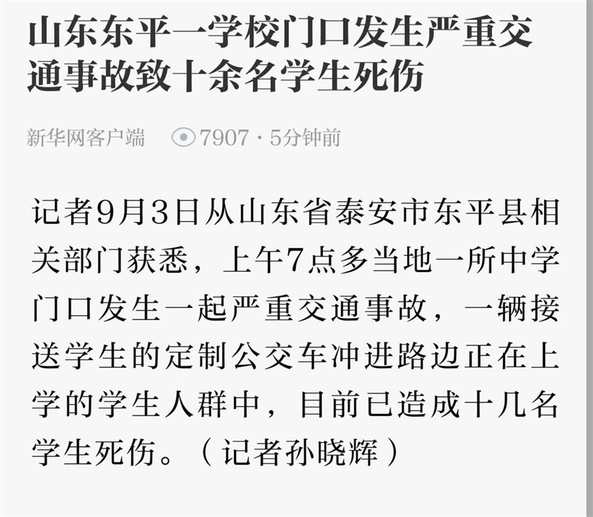 据新华网客户端,记者9月3日从山东省泰安市东平县相关部门获悉,上午7点多当地一所中学门口发生一起严重交通事故,一辆接送学生的定制公交车冲进路边正在上学的学生人群中,目前已造成十几名学生死伤。另据央视新闻,目前当地正在紧急组织受伤人员送医救治,司机已被控制。