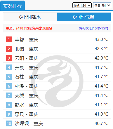 重庆大部今天高温仍是火力十足,截至15时,全国气温排行榜前十位全都被重庆气象站点包揽,最高的丰都达到了43℃,酷热难耐。