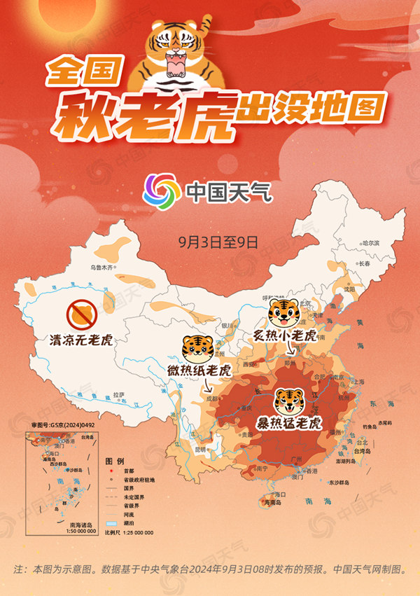 中国天气网讯 眼下已是9月,节气也行至处暑,但近期我国仍有大片高温天气,并且未来一周(9月3日至9日)还将持续,南方热度不减,难道这就是传说中的“秋老虎”?没错!秋老虎正在发威!哪里秋老虎最猛?秋老虎何时“归山”?中国天气网推出全国秋老虎出没地图,快来看看你那里遇到的是什么“虎”。