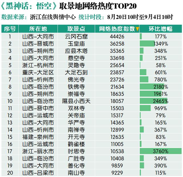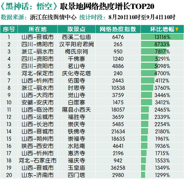 网络信息监测数据显示,8月20日10时至9月4日10时,在网络热度排名前20位的取景地中,山西省占比八成,云冈石窟、玉皇庙、应县木塔、悬空寺包揽前四位,众多保存完好且精美绝伦的古建筑直接带火了三晋大地传统文化游。来自百度指数平台的数据显示,《黑神话:悟空》上线以来,“山西旅游”词条的资讯指数较去年同期增长3178%。与此同时,浙江省内的杭州灵隐寺、丽水时思寺整体关注度也相对较高,分别排名第5位和第17位。