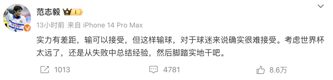 冷静过后,范志毅在其个人微博账号再次发声。他说:“实力有差距,输可以接受,但这样输球,对于球迷来说确实很难接受。考虑世界杯太远了,还是从失败中总结经验,然后脚踏实地干吧。”