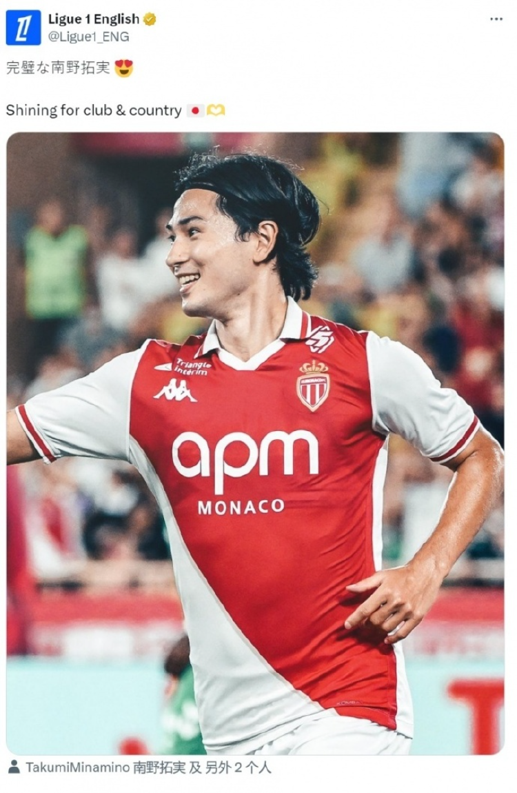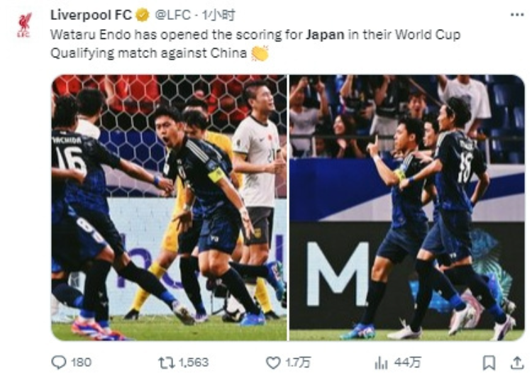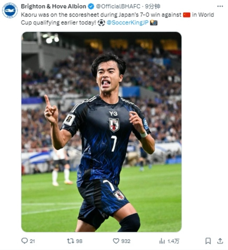 这次对阵国足进球的日本球员,也全部来自欧洲:英超利物浦的远藤航首开纪录,西甲皇家社会的久保健英和法甲摩纳哥的南野拓实双双梅开二度,英超布莱顿的三笘薰,法甲兰斯的伊东纯也各入1球。布莱顿祝贺三球王,利物浦祝贺远藤航,皇家社会祝贺久保建英,法甲官方祝贺南野拓实……无论所属球员是否进球,他们所在的欧洲俱乐部都在官方社交平台上给予祝贺。