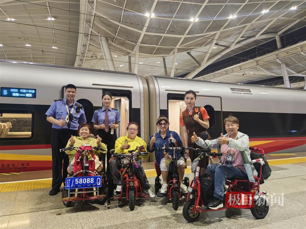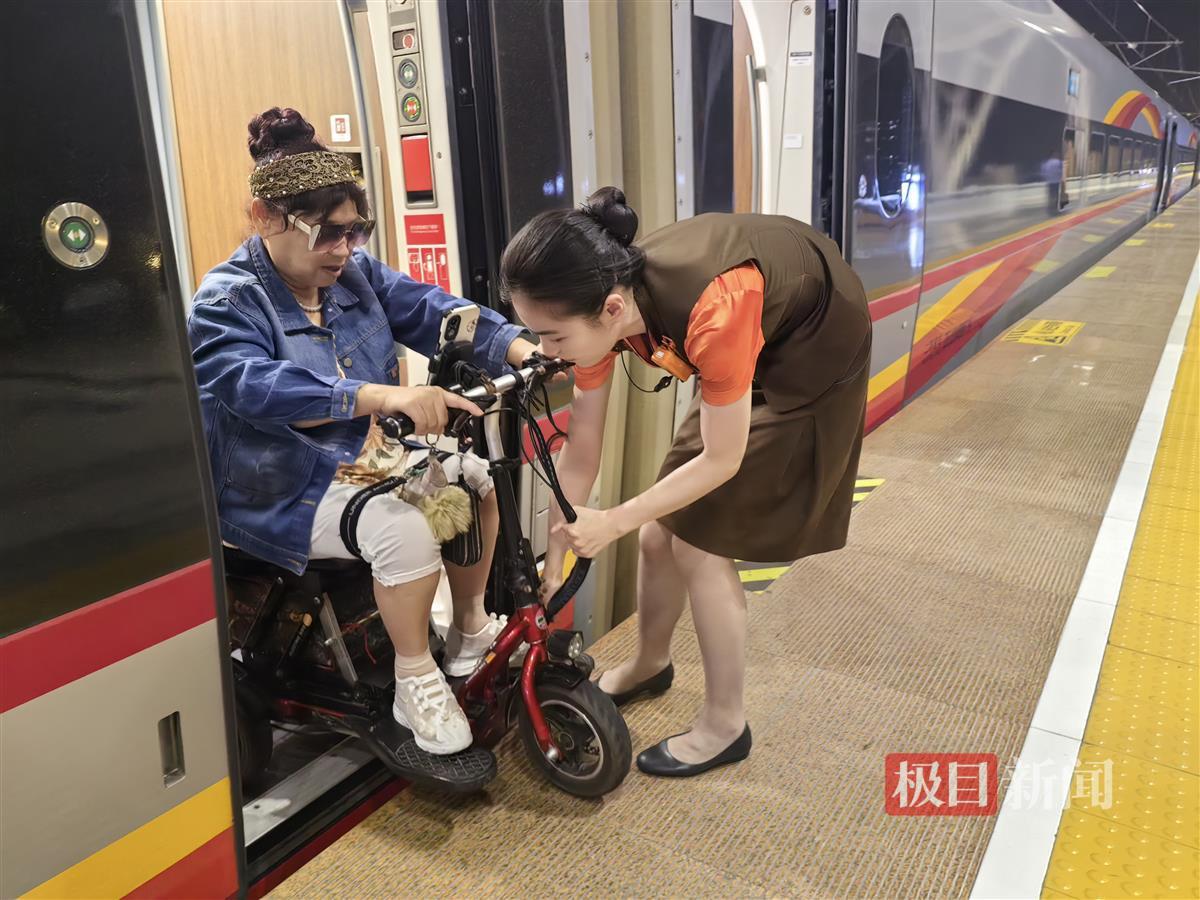 9月6日,由武汉客运段担当的G882次列车,珠海站放行作业后,列车员张颐怡在车门前立岗迎接旅客时,发现四位女士驾驶着残疾人电动车正往车门处这边驶来,由于车辆较大,旅客因为腿部残疾原因,不能下车,列车员见此便赶忙下车帮助旅客将车子一个个抬上来。
