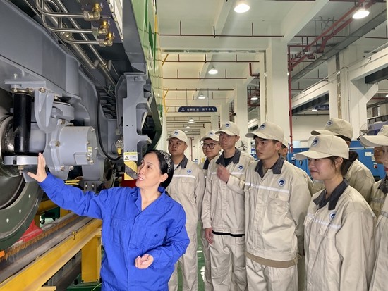 湖南铁道职业技术学院院长张莹(左一)给动车组专业的学生介绍动力集中式动车组的基本功能和性能特点。学校供图