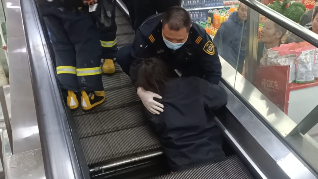 消防队员到场时,被困女性腰部以下已被扶梯“卷入”,因自动扶梯突然故障,内部结构复杂,消防队员无法直接将其救出。