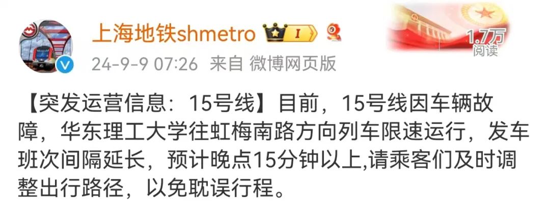 随后,@上海地铁shmetro在7点26分发布消息称,15号线因车辆故障华东理工大学往虹梅南路方向列车限速运行,预计晚点15分钟以上。