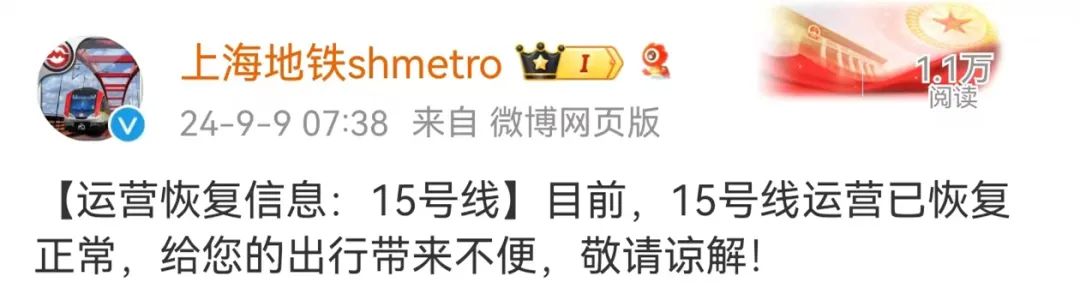 7点38分,@上海地铁shmetro再次发布消息称,目前,15号线运营已恢复正常。