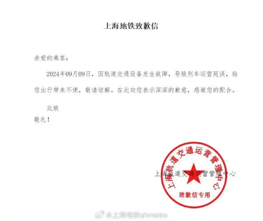@上海地铁shmetro 发布致歉信。