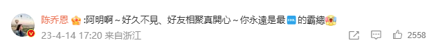 陈乔恩也在评论区留言:“阿明啊~好久不见、好友相聚真开心~你永远是最cool的霸总”。
