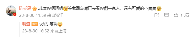 好友陈乔恩在评论区大方送上祝福:“恭喜你啊阿明,等我回台湾再去看你们一家人,还有可爱的小宝宝”。明道回复道:“好的,等你。”