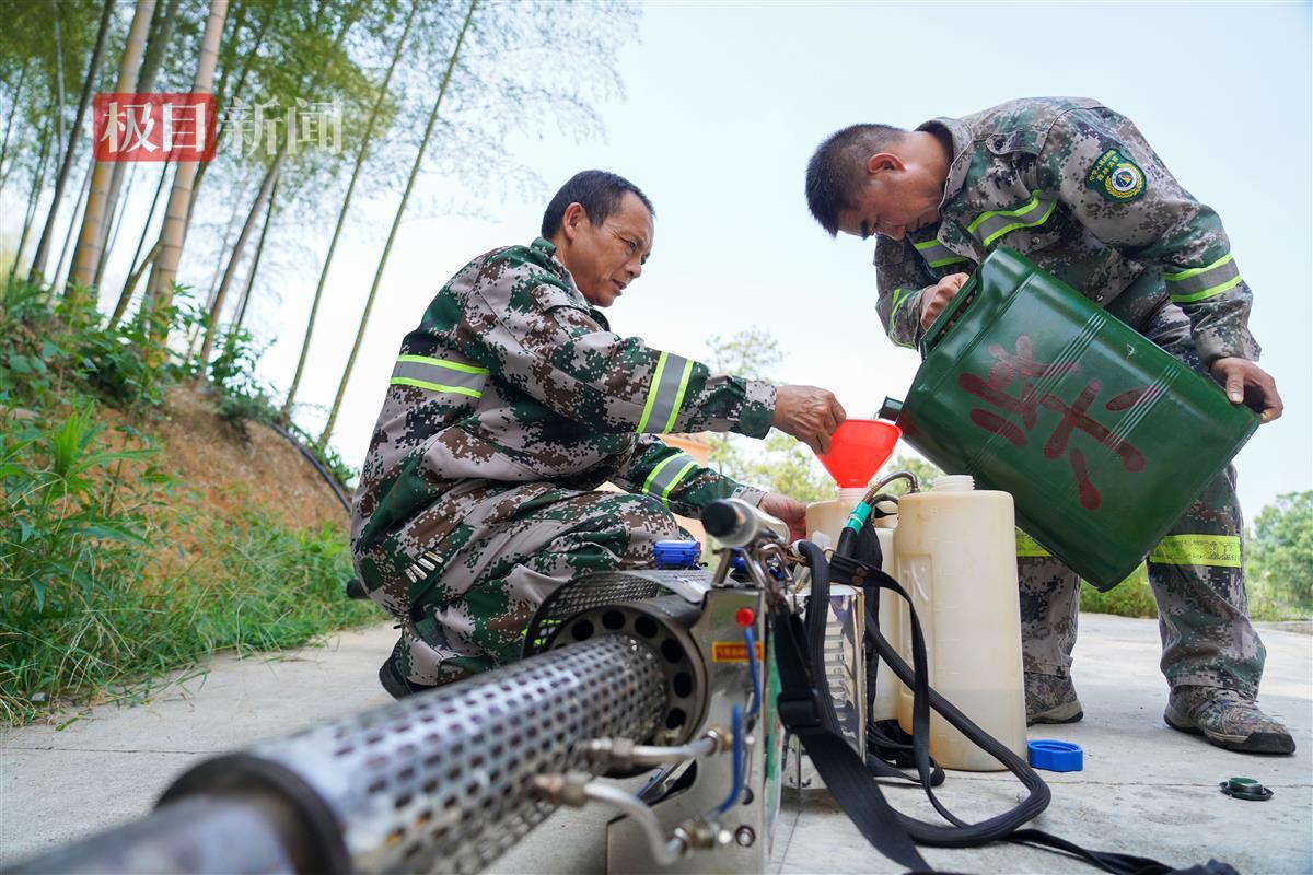 护林员鲁亚林调试好经过改良后的烟雾机后,戴着口罩就直奔竹林深处,机器一响,烟雾升腾,幸存的竹蝗四处逃窜。
