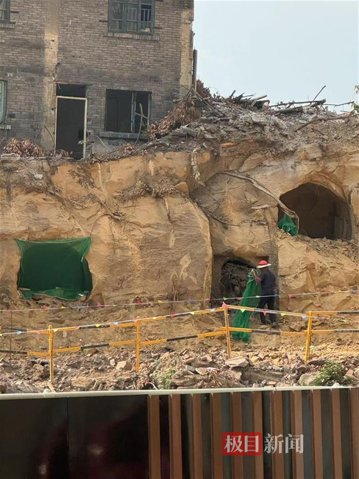 14日15时40分许,一名工作人员来到几个洞口处,在左边三个洞口挂上了工地使用的绿色覆盖网。附近一名店家告诉极目新闻记者,14日上午有多名专家赶来勘察。