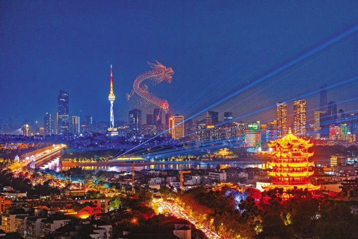 在隔江相望的龟山之上,一条红色巨龙脚踏祥云,一飞冲天。长江流域十三省区市文化地标次第展示。 (倪娜 摄)
