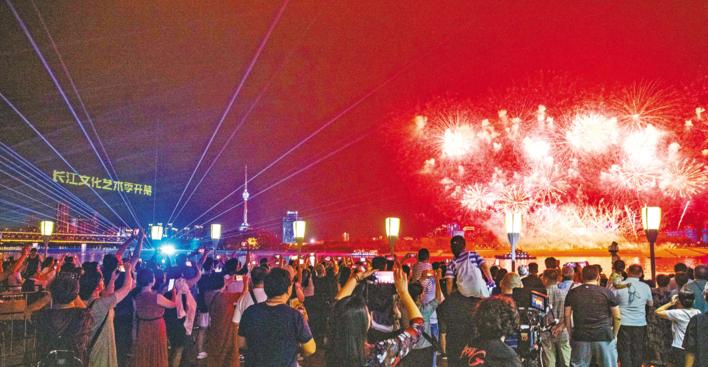 不同于舞台或场馆演出,长江文化艺术节将开幕式设立于武汉长江江面,从长江大桥至长江二桥的江段成为长江文化艺术季开篇之作的舞台。以江流和天际为尺度的舞台,让不少市民能在家中观礼。在武昌江边的高楼上,市民孙闻带着家人驻足眺望,“两只凤凰绕江飞行,灵动飘逸,就像要飞进我家阳台一样。”孙闻拿起手机记录下这一幕。