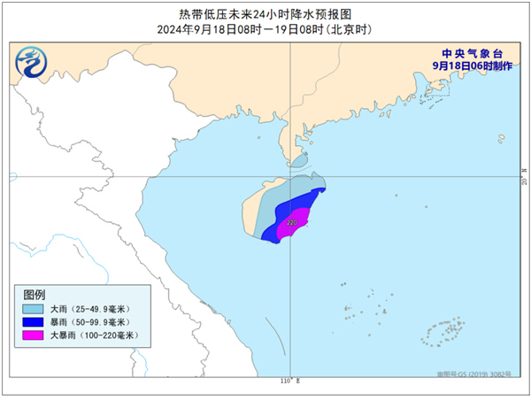 降水预报:9月18日08时至19日08时,海南岛有大到暴雨,其中海南岛东南部有大暴雨(100~220毫米)。