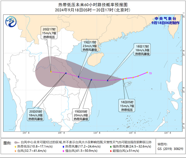 大风预报:9月18日08时至19日08时,南海大部海域、琼州海峡、北部湾将有6-8级、阵风9级的大风。