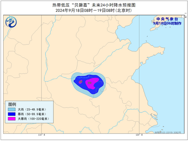 降水预报:9月18日08时至19日08时,河南中东部、安徽西北部、山东西南部等地部分地区有大到暴雨,其中,河南东部、山东西南部等地部分地区有大暴雨(100~220毫米)。