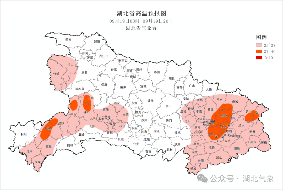 湖北发布高温黄色预警,预计9月19日白天,十堰南部、恩施低海拔地区、宜昌、孝感南部、武汉、黄冈、黄石、鄂州、咸宁等地最高气温将超过35℃,其中恩施、宜昌、武汉、黄冈局地可达37℃以上。
