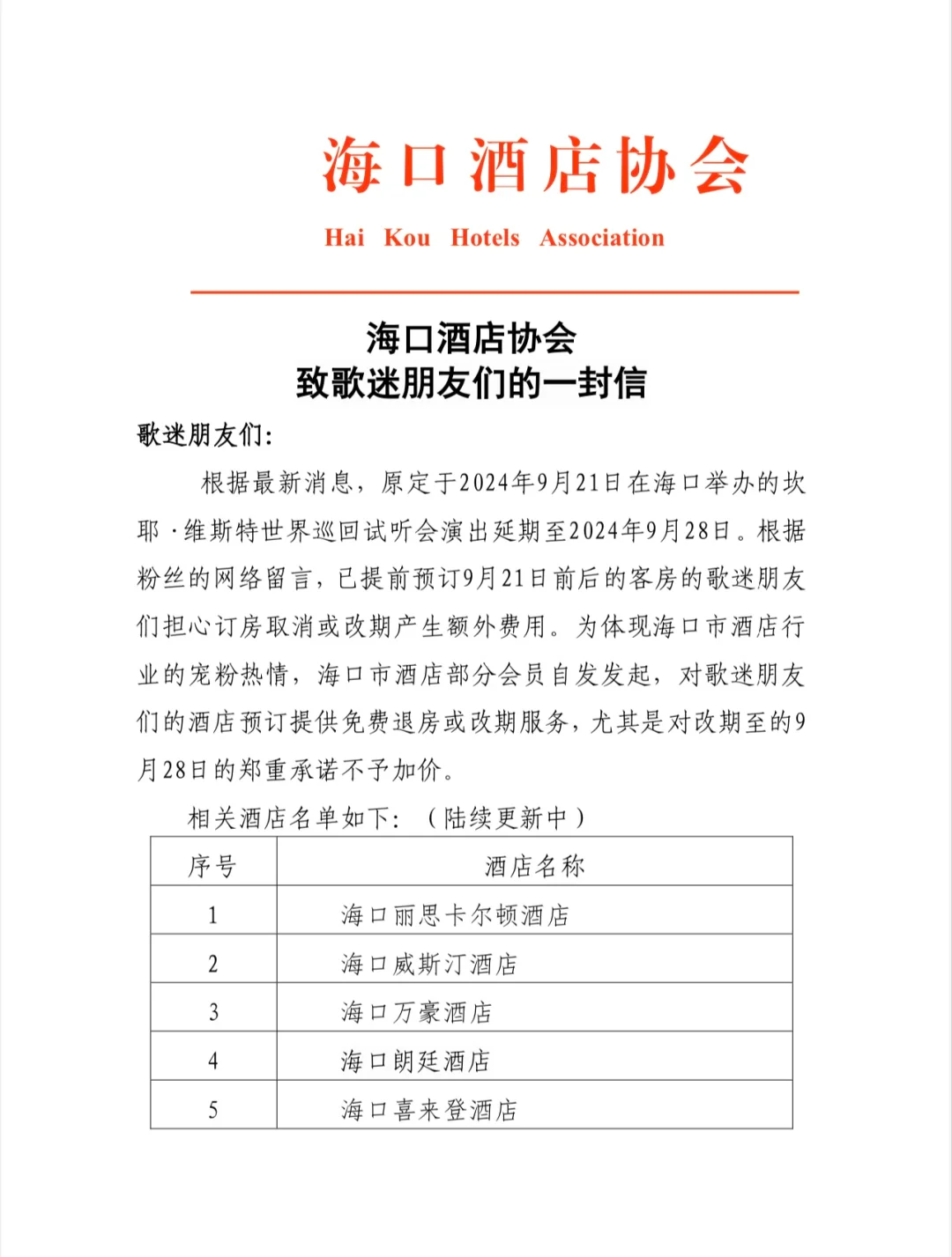 试听会宣布延期后,不少歌迷担心订房取消或改期产生额外费用,海口市40家重点旅游接待酒店当即提供免费退订和免费改期预订服务,诚意再度收获好评,“这下海口在全国旅文局里都遥遥领先了”。