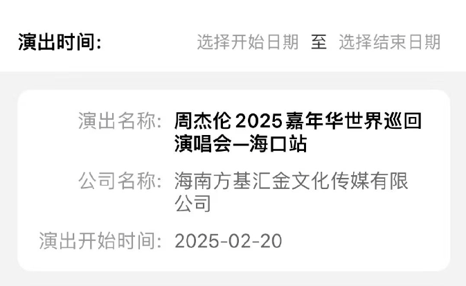 此外,据文旅市场通app显示,周杰伦2025嘉年华巡回演唱会 - 海口站,演出开始时间为2025年2月20日,备受期待。